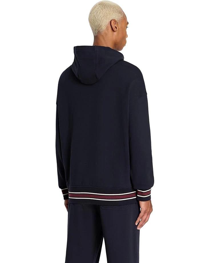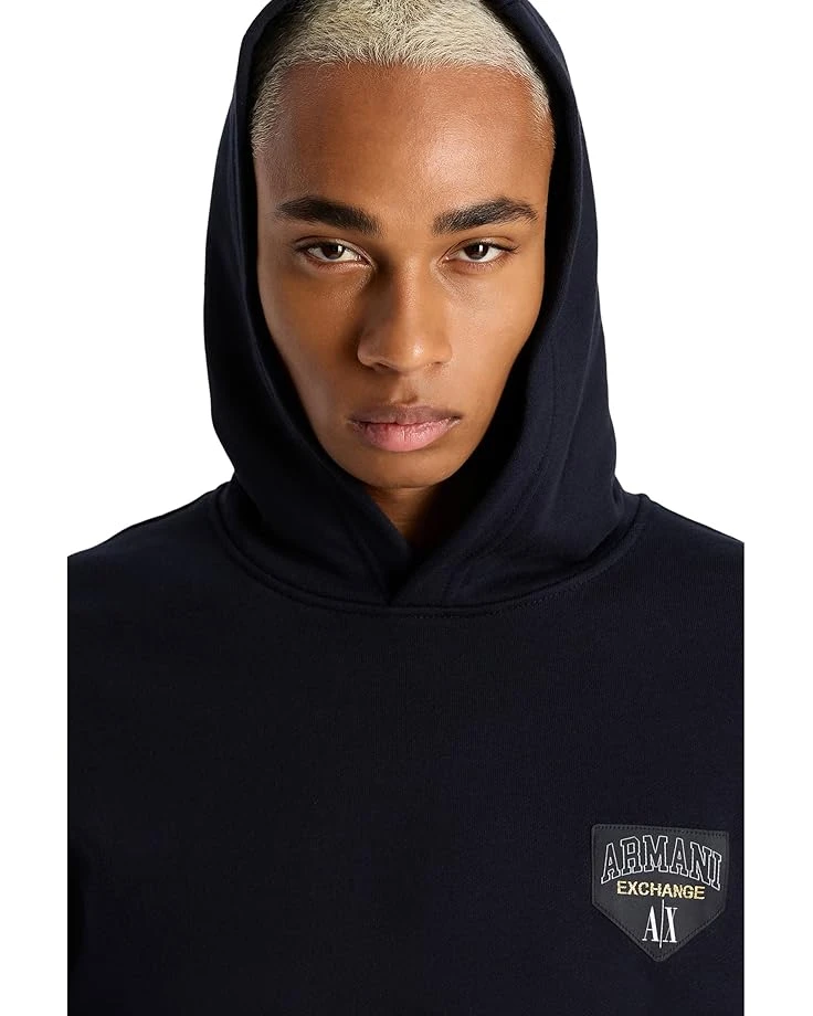 - Attain that long-lasting durability and snugness donning the Armani Exchange® Collegiate Fleece Hoodie. The pull-on style hoodie has stripes detailing on the the sleeves cuffs and hemline, and brand detailing on the left chest, and hooded construction.