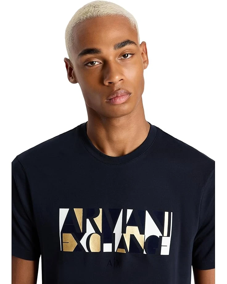 - Strengthen your dapper look donning the Armani Exchange® Metallic Logo Tee. Featuring pull-on construction, metallic brand detailing on the front for a lustrous glance, and straight hemline.