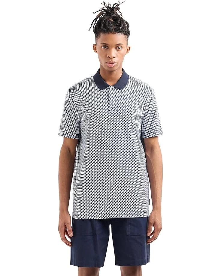 - Sport an elevated classic look while enjoying that laid-back, casual feel all day long wearing the Armani Exchange® Regular Fit Printed All Over Logo Pique Polo. Boasting a printed logo pattern throughout, the piece comes with a solid-colored polo collar with a quarter-buttoned placket, short sleeves, and a regular fit.