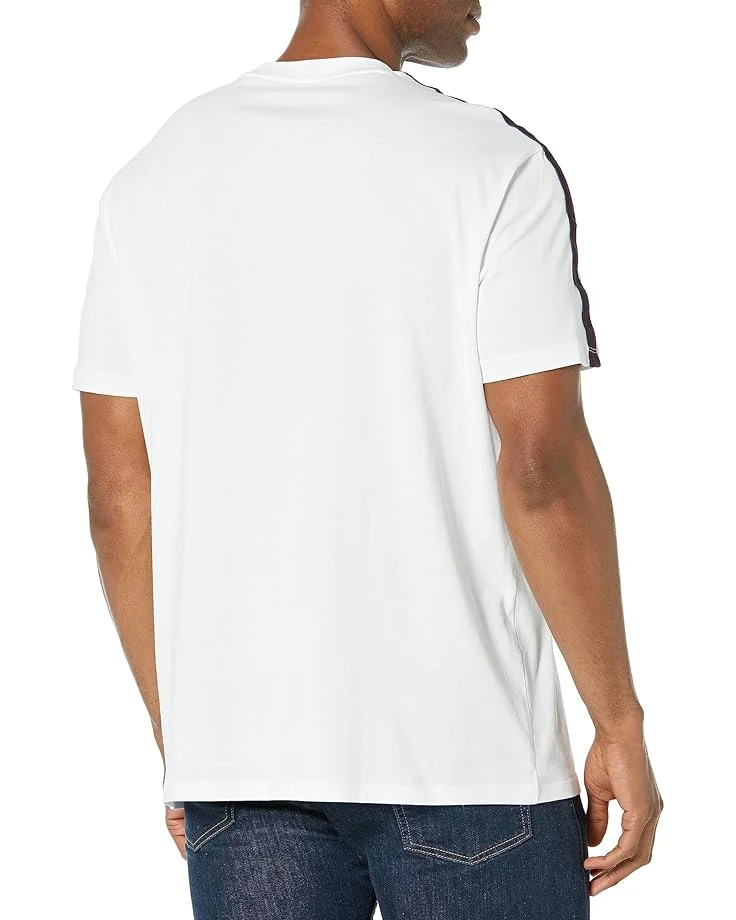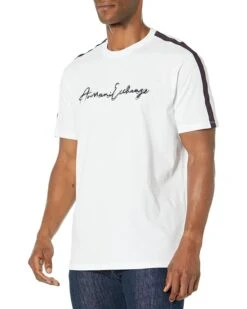 - Express your individuality with this pullover cotton fabric Armani Exchange® Script Logo Tee. This classic solid color tee features ribbed crew neckline and short sleeves with strip over the shoulders.