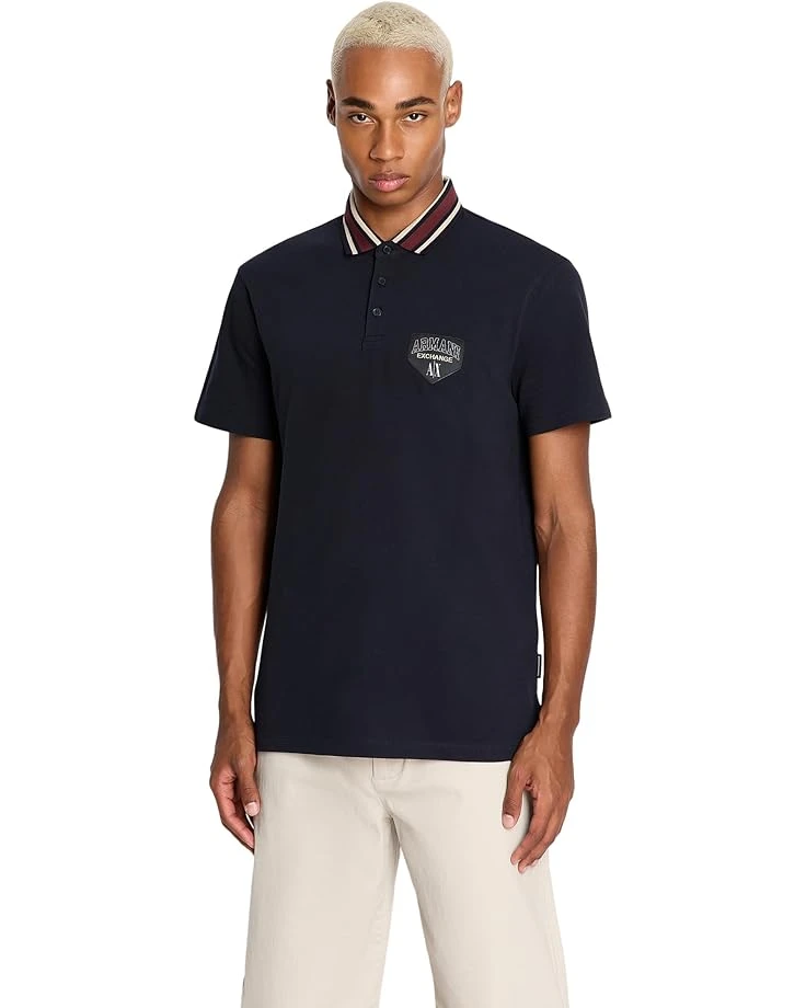 - Make your sporty look classy donning the Armani Exchange® Slim Fit Collegiate Logo Polo. Featuring collared neckline with stripe detailing through the shoulder make your look stunning, three-button placket, and brand detailing on the left chest.