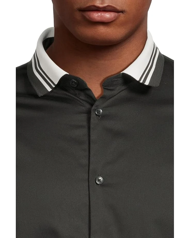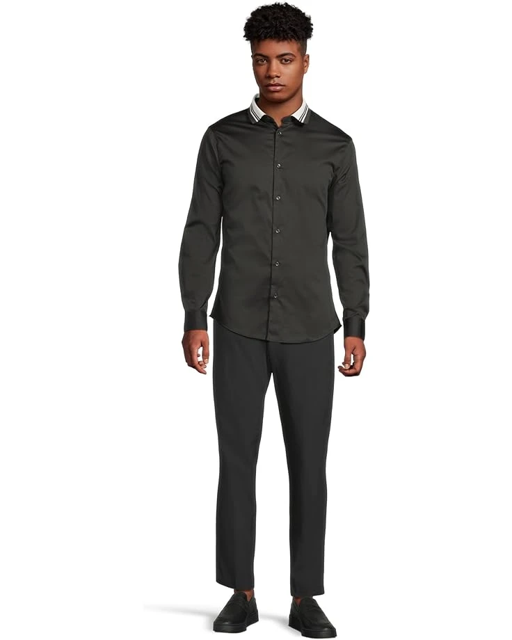 - Look sleek and smart on the next occasion wearing the Armani Exchange® Stretch Cotton Satin Long Sleeve Shirt. The slim-fit shirt features a contrasting collared neck, long sleeves with buttoned cuffs, a full button-front closure, and a shirttail hem.
