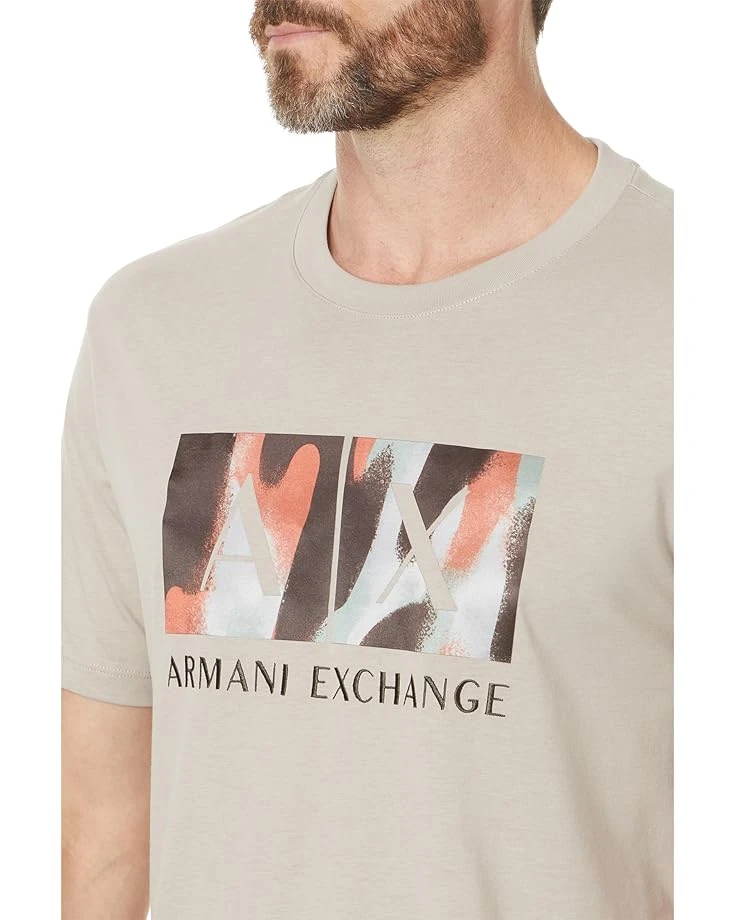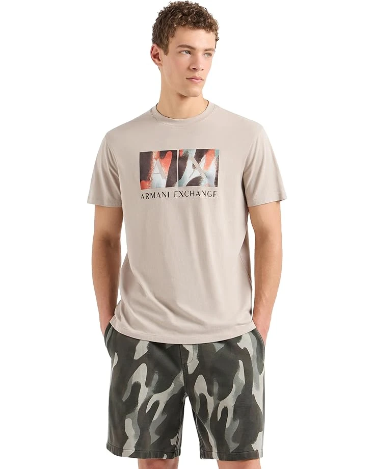 - Step up the style game effortlessly wearing the Armani Exchange® Classic Ax Armani Exchange Box Logo With Camo Background Regular Fit Tee. The regular-fit, breathable tee features a crew neck, short sleeves, A|X box logo text with camo background, and a standard-length silhouette with a straight hem, making it perfect for everyday wear.